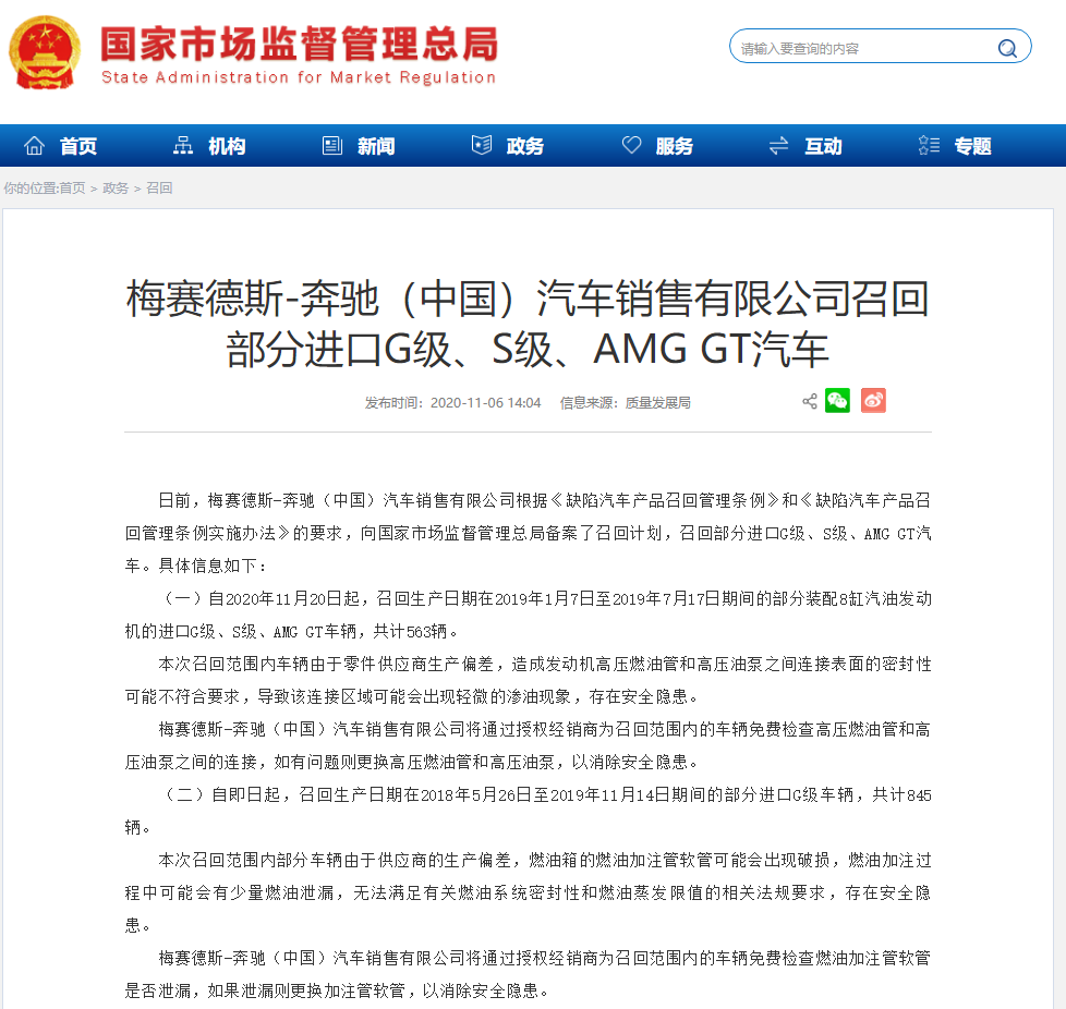 (一)自2020年11月20日起,召回生產(chǎn)日期在2019年1月7日至2019年7月17日期間的部分裝配8缸汽油發(fā)動機(jī)的進(jìn)口G級、S級、AMG GT車輛,共計(jì)563輛。
