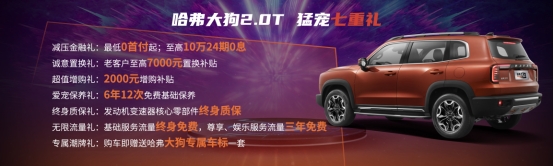 減壓金融禮:首付低至0元起,至高10萬元24期0利息;誠意置換禮:哈弗SUV老客戶購車可享至高7000元置換補(bǔ)貼;超值增購禮:哈弗SUV增購客戶可2000元增購補(bǔ)貼;愛寵保養(yǎng)禮:購車即享6年12次免費(fèi)基礎(chǔ)保養(yǎng)服務(wù);終身質(zhì)保禮:發(fā)動機(jī)變速器核心零部件終身質(zhì)保;無限流量禮:基礎(chǔ)服務(wù)流量終身免費(fèi),尊享、娛樂服務(wù)流量三年免費(fèi)