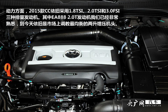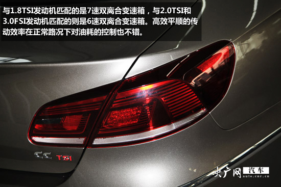 動力方面,2015款CC依舊采用1.8TSI、2.0TSI和3.0FSI三種排量發(fā)動機,與1.8TSI發(fā)動機匹配的是7速雙離合變速箱,與2.0TSI和3.0FSI發(fā)動機匹配的則是6速雙離合變速箱。高效平順的傳動效率在正常路況下對油耗的控制也不錯。
