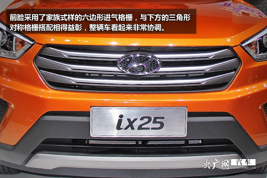 在外觀設(shè)計(jì)方面,ix25采用了現(xiàn)代的家族設(shè)計(jì)理念——流體雕塑,車身各處線條非常尖利,前臉采用了家族式樣的六邊形進(jìn)氣格柵,與下方的三角形對(duì)稱格柵搭配相得益彰,整輛車看起來(lái)非常協(xié)調(diào)。