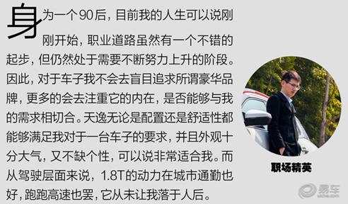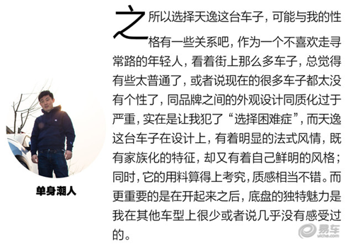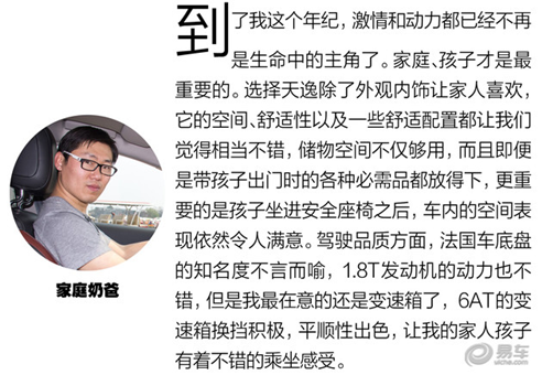 作為一款有顏值、有內(nèi)涵的法系城市SUV,天逸在很多方面的表現(xiàn)都算是不錯(cuò)的,我自己也因?yàn)楣ぷ髟蜷_過(guò)幾次,尤其是它的底盤調(diào)教可以說(shuō)深得我心。而今天通過(guò)三位年輕的車主,從各自不同的角度談?wù)撨@臺(tái)車子,也著實(shí)讓我們可以對(duì)天逸有更進(jìn)一步的了解——除了駕駛,在外觀、配置、舒適性等各方面的出色表現(xiàn)。從編輯自身的角度出發(fā),僅憑駕駛感受方面的表現(xiàn),天逸就是一臺(tái)值得購(gòu)買的車子,而結(jié)合三位消費(fèi)者的觀點(diǎn),在其他方面的表現(xiàn)又是否能夠滿足各位看官您的需求呢?