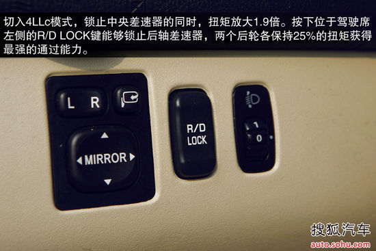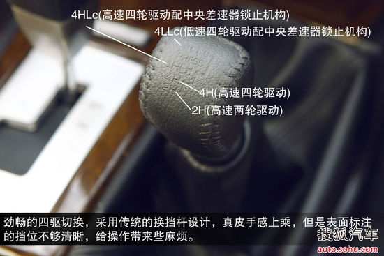 勁暢仍然使用傳統(tǒng)的四驅(qū)切換操作桿設(shè)計(jì),操作桿與換擋桿采用了相同的真皮包裹,手感上乘。位于皮革表面的四驅(qū)檔位標(biāo)示有些模糊,給初次接觸這套系統(tǒng)的用戶帶來了一些麻煩。其四驅(qū)采用三菱的SS4超選四驅(qū)系統(tǒng),提供2H(高速兩輪驅(qū)動(dòng))、4H(高速四輪驅(qū)動(dòng))、4HLc(高速四輪驅(qū)動(dòng)配中央差速器鎖止機(jī)構(gòu))、4LLc(低速四輪驅(qū)動(dòng)配中央差速器鎖止機(jī)構(gòu))四種模式。