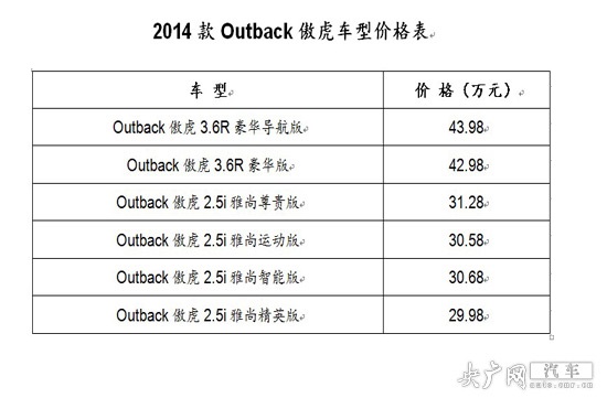 2014年1月11日,斯巴魯汽車(中國)有限公司公布了2014款Outback傲虎的價格并宣布新車型從即日起在中國市場正式上市銷售。這款新車型通過更為精簡合理的款型設(shè)置和外觀、內(nèi)飾方面的新增配置使性價比得到大幅提升,其價格區(qū)間為29.98~43.98萬元。