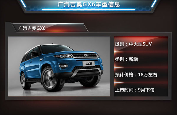 國(guó)內(nèi)SUV市場(chǎng)的持續(xù)熱銷給了自主車企更多的信心,像吉利、哈弗等知名自主品牌紛紛計(jì)劃推出自己的高端SUV車型。一方面是為了提振品牌自身形象,更重要的一點(diǎn)就是想要借此在市場(chǎng)中獲得更高收益。面對(duì)如此大的一塊“蛋糕”,廣汽吉奧自然不甘于落后,先是在上半年的北京國(guó)際車展上發(fā)布了一款代號(hào)為GA6470的高端SUV車型,隨后又在前不久正式對(duì)外宣布將該車命名為GX6。近日,網(wǎng)通社從國(guó)家工信部獲取了GX6的最新消息,2.4L版本車型最大功率100kw,百公里綜合工況為10.2L。按照廣汽吉奧官方的說法,首批GX6最早將于9月下旬到店銷售。