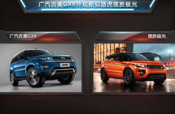我們通過廣汽吉奧GX6的外觀造型能看出,該車的不少細(xì)節(jié)都是以路虎攬勝極光的設(shè)計(jì)元素為原型所打造的。值得一提的是,與攬勝極光相比,廣汽GX6的車身明顯更加高大。鷹眼大燈、U形前臉與大面積中網(wǎng)的融合度很高。而這些前臉設(shè)計(jì),無論是大燈、霧燈、進(jìn)氣格柵還是保險(xiǎn)杠亮色下護(hù)板,均與攬勝極光高度相似。