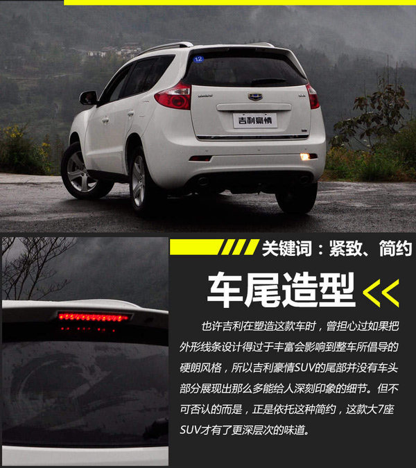 也許吉利在塑造這款車時(shí),曾擔(dān)心過如果把外形線條設(shè)計(jì)得過于豐富會(huì)影響到整車所倡導(dǎo)的硬朗風(fēng)格,所以吉利豪情SUV的尾部并沒有車頭部分展現(xiàn)出那么多能給人深刻印象的細(xì)節(jié)。但不可否認(rèn)的而是,正是依托這種簡(jiǎn)約,這款大7座SUV才有了更深層次的味道。