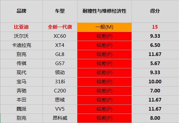 耐撞性與維修經(jīng)濟性——整體指數(shù)成績?yōu)镸(一般)。唐燃油尤其在耐撞性上表現(xiàn)令人滿意,在滿分6分的情況下,正面碰撞取得了5分。從所有參與該項測試的車型來看,67%的測試車型該項成績?yōu)镻(較差),僅有21%的測試車型取得了M(一般)的成績,表現(xiàn)優(yōu)于一些合資熱門車型。