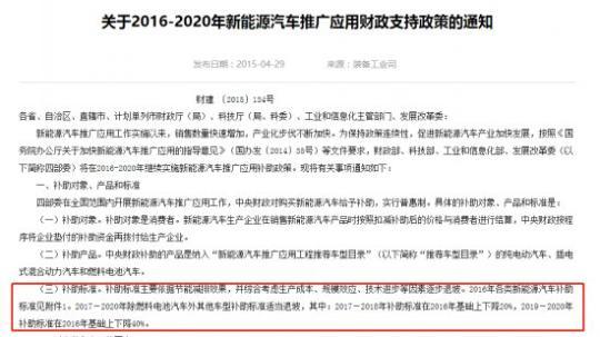 引起新能源汽車市場“變天”的補貼政策,其綱領性文件是由財政部、科技部、工業(yè)和信息化部、發(fā)展改革委于2015年5月聯合發(fā)布的《關于2016-2020年新能源汽車推廣應用財政支持政策的通知》,針對純電動汽車、插電式混合動力汽車和氫燃料電池汽車三種技術路線在內的新能源汽車提供財政補貼。