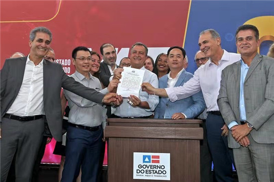 在巴伊亞州民政部長Bruno Dauster(后排中)的見證下,比亞迪巴西分公司總經(jīng)理李鐵與巴伊亞州交通運(yùn)營公司CTB主席José Eduardo Ribeiro Copello共同簽署整體設(shè)計(jì)方案合約