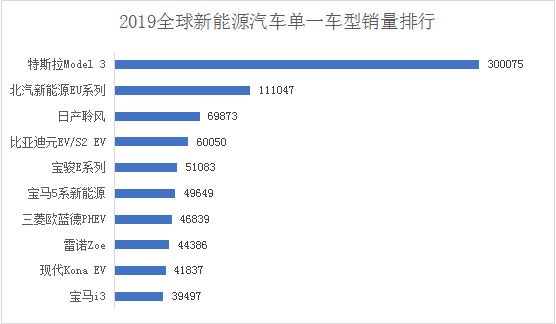 從單一產(chǎn)品銷量看,全球排名前五的全部都是純電動車型。特斯拉Model 3以300075輛的業(yè)績名列榜首,其次為北汽新能源EU系列,年銷111047輛。到目前為止,在全球所有的新能源車型中,只有這兩款的年銷量達到10萬以上。同時,這也是中國新能源汽車單一車型年度銷量首次突破10萬大關(guān)。