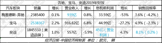 3月17日,大眾集團(tuán)發(fā)布其2019年財(cái)報(bào),奧迪去年主要財(cái)務(wù)指標(biāo)隨之亮相。對(duì)比奔馳、寶馬此前已經(jīng)公布的財(cái)報(bào)來看,去年全年,BBA基本延續(xù)了前三季度財(cái)報(bào)中各自優(yōu)勢(shì)。