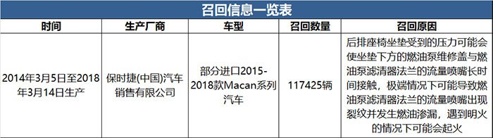 本次召回范圍內(nèi)的部分車輛在使用時(shí),后排座椅坐墊受到的壓力可能會(huì)使坐墊下方的燃油泵維修蓋與燃油泵濾清器法蘭的流量噴嘴長時(shí)間接觸,極端情況下可能導(dǎo)致燃油泵濾清器法蘭的流量噴嘴出現(xiàn)裂紋并發(fā)生燃油滲漏,遇到明火的情況下可能會(huì)起火,存在安全隱患。保時(shí)捷(中國)汽車銷售有限公司將為召回范圍內(nèi)的車輛免費(fèi)檢修或更換燃油泵維修蓋;同時(shí)檢查燃油泵濾清器法蘭的流量噴嘴處是否有裂紋,如有裂紋則更換燃油泵濾清器法蘭,以消除安全隱患。由于配件籌備的原因,在2020年10月之前對(duì)涉及的車輛免費(fèi)檢修燃油泵維修蓋;在此之后,對(duì)涉及的車輛免費(fèi)更換改進(jìn)后的燃油泵維修蓋。