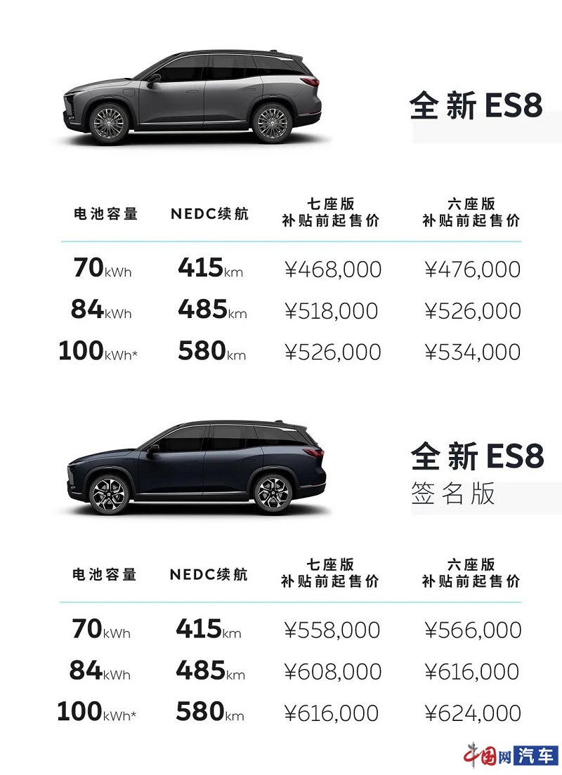 據(jù)悉,全新蔚來(lái)ES8搭載160千瓦永磁電機(jī)與240千瓦感應(yīng)電機(jī)的全新動(dòng)力組合,兼顧了長(zhǎng)續(xù)航與高性能。此外,全新蔚來(lái)ES8擁有4.9秒的百公里加速性能。搭載全新100千瓦時(shí)液冷恒溫電池包后,全新蔚來(lái)ES8的NEDC續(xù)航可達(dá)580公里。