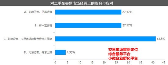 流通協(xié)會(huì)同時(shí)指出,政策對(duì)傳統(tǒng)二手車(chē)市場(chǎng)經(jīng)營(yíng)模式將帶來(lái)巨大沖擊,并倒逼二手車(chē)交易市場(chǎng)轉(zhuǎn)型升級(jí)。調(diào)查中,有41.3%的經(jīng)營(yíng)主體認(rèn)為“受政策影響,二手車(chē)交易市場(chǎng)轉(zhuǎn)型升級(jí)迫在眉睫”。羅磊建議,傳統(tǒng)二手車(chē)經(jīng)營(yíng)模式需要向綜合服務(wù)平臺(tái),小微企業(yè)孵化平臺(tái)轉(zhuǎn)變,經(jīng)營(yíng)主體應(yīng)對(duì)交易市場(chǎng)進(jìn)行重新定位。