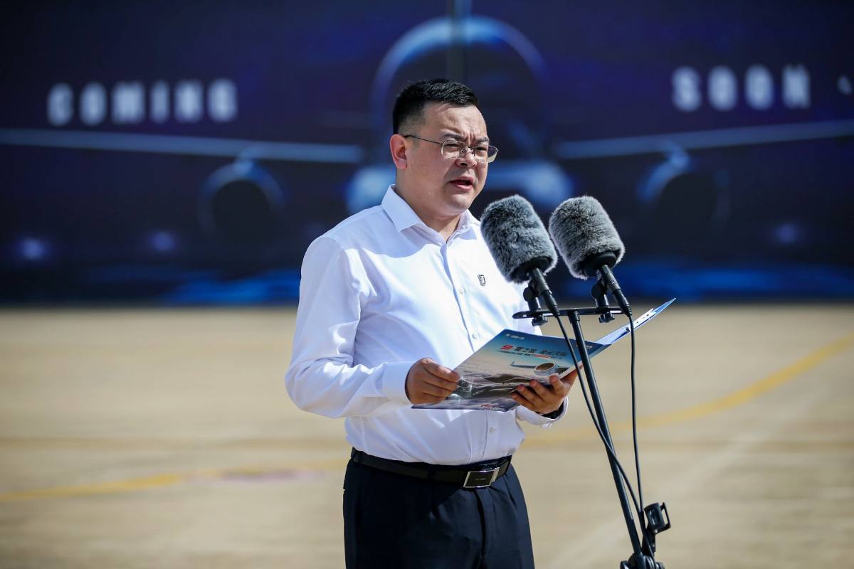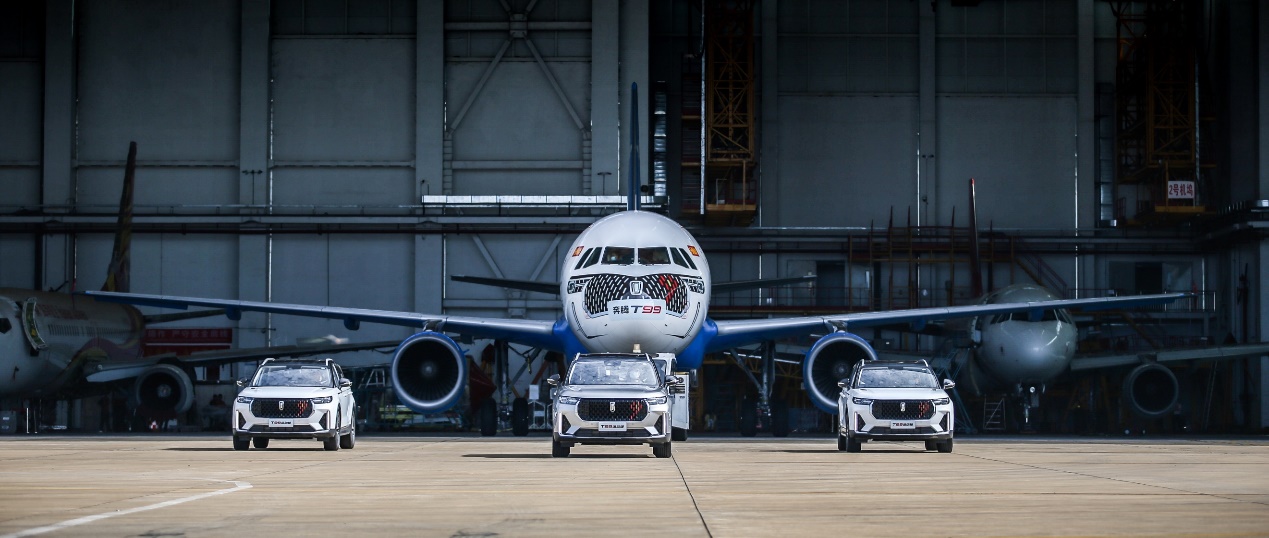 涂裝T99形象的首航飛機(jī),隨著機(jī)庫門的打開,在3臺奔騰T99運(yùn)動(dòng)版車型的伴隨下隆重出場。
