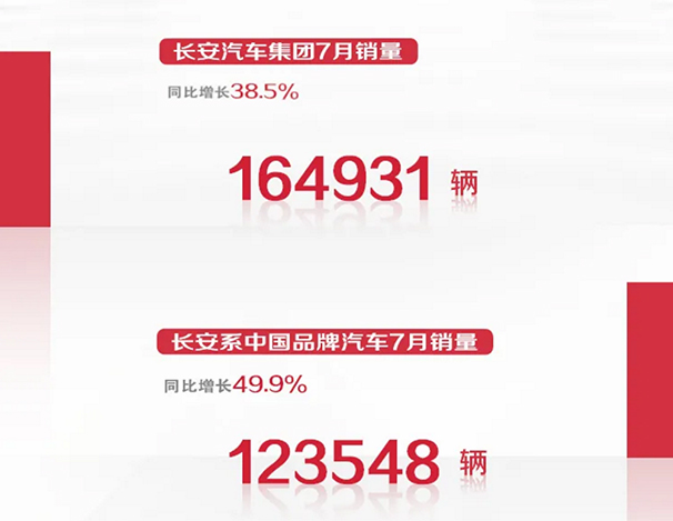 長安汽車對外公布的數(shù)據(jù)顯示,2020年7月延續(xù)上升勢頭,長安汽車單月整體銷售164931輛,同比增長38.5%。其中,長安系中國品牌汽車7月銷量達(dá)到123548輛,同比增長達(dá)49.9%。