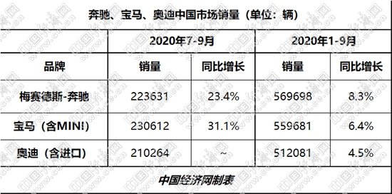 國內(nèi)車市持續(xù)快速回暖,高檔車市則繼續(xù)為其提供較強支撐。從“頭部陣營”的BBA來看,寶馬繼二季度之后,再度折桂三季度;前9月,BBA三家累計銷量均超51萬輛,奔馳則以近57萬輛的成績繼續(xù)保持領(lǐng)先。有業(yè)內(nèi)人士表示,三家品牌今年全年都將有望小幅超越去年銷量水平。