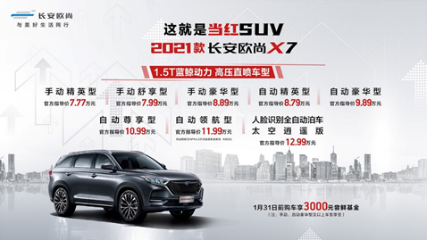 12月29日,2021款長(zhǎng)安歐尚X7上市,共推1.5T+6MT和1.5T+7DCT兩種動(dòng)力組合共8款車型,官方指導(dǎo)價(jià)7.77萬元-12.99萬元。