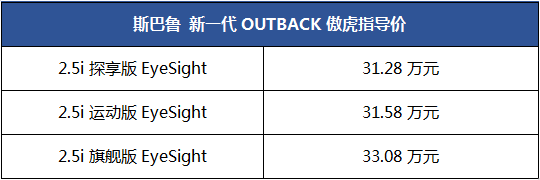 據(jù)了解,新一代OUTBACK傲虎市場指導價格區(qū)間為31.28萬元-33.08萬元,包括2.5i探享版EyeSight、2.5i運動版EyeSight 、2.5i旗艦版EyeSight共3款車型。