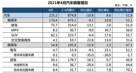 具體來(lái)看,4月,我國(guó)汽車產(chǎn)銷分別達(dá)到223.4萬(wàn)輛和225.2萬(wàn)輛,環(huán)比下降9.3%和10.8%,同比增長(zhǎng)6.3%和8.6%;1-4月,汽車產(chǎn)銷分別完成858.6萬(wàn)輛和874.8萬(wàn)輛,同比分別增長(zhǎng)53.4%和51.8%,增幅比1-3月回落28.3和23.8個(gè)百分點(diǎn)。