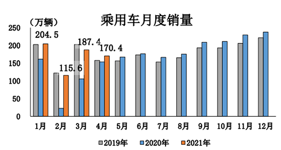 1-4月,乘用車產(chǎn)銷分別完成666.8萬(wàn)輛和679.1萬(wàn)輛,同比分別增長(zhǎng)55.3%和53.1%。增幅比1-3月回落27.8和22個(gè)百分點(diǎn)。與2019年同期相比,產(chǎn)銷同比分別下降3.4%和0.9%,降幅較1-3月分別減小2.1和2.9個(gè)百分點(diǎn)。