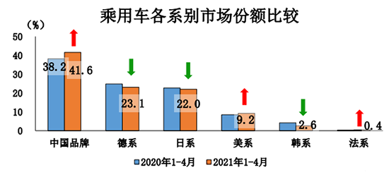 此外,4月,中國(guó)品牌乘用車銷量環(huán)比小幅下降,同比繼續(xù)保持較快增長(zhǎng)。當(dāng)月共銷售71.9萬(wàn)輛,環(huán)比下降3.5%,同比增長(zhǎng)34.8%,占乘用車銷售總量的42.2%,占有率比上月提升2.4個(gè)百分點(diǎn),比上年同期提升7.5個(gè)百分點(diǎn)。分車型來(lái)看,中國(guó)品牌轎車、SUV和MPV市場(chǎng)占有率分別為27.7%、50.1%和66.8%;與上月相比,轎車和SUV市場(chǎng)占有率均呈增長(zhǎng),MPV有所下降。