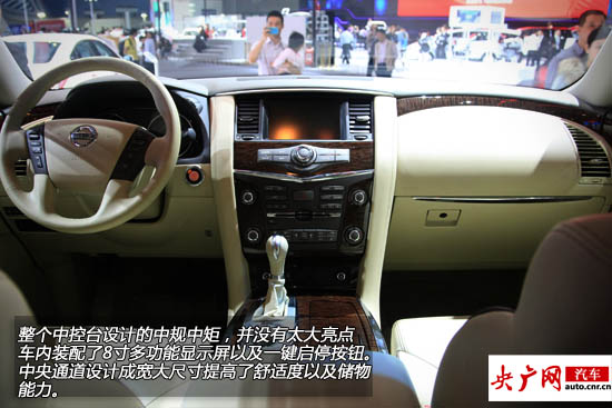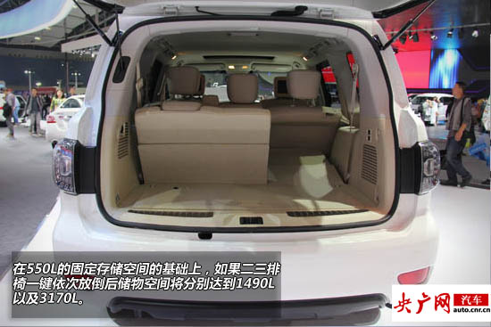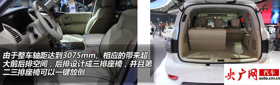 此款車(chē)型為三排座車(chē)型,第二,三排座可以通過(guò)自動(dòng)按鍵一鍵放倒進(jìn)一步增大儲(chǔ)物空間。車(chē)內(nèi)配備三屏智能影音娛樂(lè)系統(tǒng),13揚(yáng)聲器BOSE高保真音響系統(tǒng),三區(qū)自動(dòng)空調(diào),座椅以及方向盤(pán)加熱系統(tǒng),6.0L雙向開(kāi)啟車(chē)載冰箱。安全性配置也與現(xiàn)款車(chē)型基本一致,智能行車(chē)安全輔助系統(tǒng),NAVI智行系統(tǒng)以及日產(chǎn)的“CARWINGS智行”系統(tǒng)。多重靜音技術(shù)能夠達(dá)到靜謐的行駛空間。