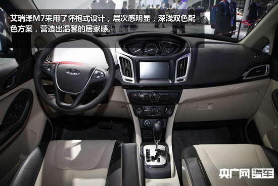 內(nèi)飾方面,艾瑞澤M7采用了懷抱式設計,層次感明顯,深淺雙色配色方案,營造出溫馨的居家感。艾瑞澤M7中控臺的一大設計亮點是把儀表盤設計在了中控臺中央,但似乎駕駛員看起來不太方便。儀表盤采用了菱形設計,造型時尚。 中控臺配備了7寸彩色觸摸屏,清晰度和靈敏度欠佳。 車內(nèi)還配備了全景天窗,車內(nèi)的采光和通風效果得到提升,但尺寸并不算大。