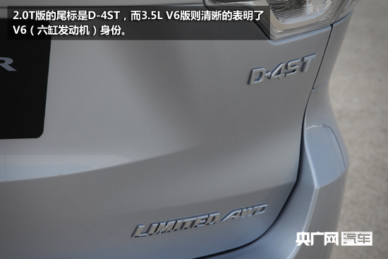 車輪輪轂根據(jù)配置高低有18寸和19寸兩個(gè)尺寸,共有三種輪轂造型可供選擇,輪胎則采用了韓泰、鄧祿普和東洋三個(gè)品牌,其中我們的2.0T四驅(qū)頂配試駕車配備的是東洋輪胎。如果想辨識(shí)全新漢蘭達(dá)是2.0T版還是3.5L V6版,最容易的辦法就是看尾標(biāo),2.0T版的尾標(biāo)是D-4ST,而3.5L V6版則清晰的表明了V6(六缸發(fā)動(dòng)機(jī))身份。
