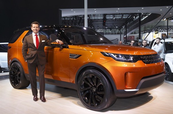 路虎全球設(shè)計(jì)總監(jiān)兼首席創(chuàng)意官哲芮勛先生與路虎發(fā)現(xiàn)Vision概念車合影