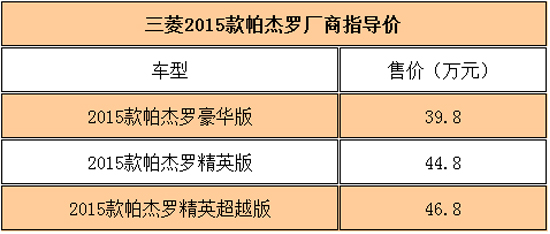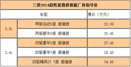 在2014年成都車展上,三菱歐藍(lán)德超值版和2015款帕杰羅正式上市,歐藍(lán)德售價(jià)區(qū)間為22.98萬(wàn)元-34.48萬(wàn)元;帕杰羅售價(jià)區(qū)間為39.8萬(wàn)元-46.8萬(wàn)元。
