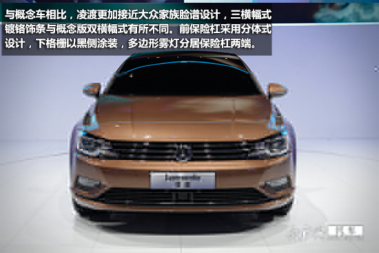 與概念車相比,凌渡更加接近大眾家族臉譜設計,三橫幅式鍍鉻飾條與概念版雙橫幅式有所不同。前保險杠采用分體式設計,下格柵以黑側(cè)涂裝,多邊形霧燈分居保險杠兩端。前大燈組采用遠近光一體式氙氣大燈。上海大眾凌渡的單腰線十分干練,多幅輪轂與概念車相比缺少一些運動風。