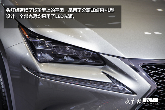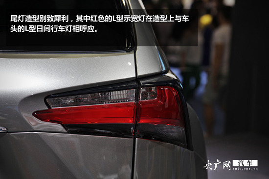 外觀方面,NX的車頭部分帶有明顯的雷克薩斯家族式設(shè)計(jì),紡錘形進(jìn)氣格柵+分離式頭燈的樣式非常有辨識(shí)度。頭燈組延續(xù)了IS車型上的基因,采用了分離式結(jié)構(gòu)+L型設(shè)計(jì),全部光源均采用了LED光源。其中L型的獨(dú)立日間行車燈造型犀利,十分驚艷。