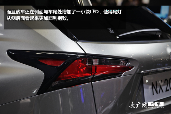 NX的車身側(cè)面采用了復(fù)雜卻有序的設(shè)計(jì),線與面的結(jié)合沒(méi)有絲毫沖突,顯示了超強(qiáng)的立體感。整體看起來(lái)非常運(yùn)動(dòng),感覺(jué)所有的線條從前流動(dòng)到車位處匯聚在一處。NX沒(méi)有采用與車身同色的后視鏡顏色,而是采用了黑色涂裝并加入銀色裝飾,既運(yùn)動(dòng)又時(shí)尚。NX 200t F-Sport采用了獨(dú)特的多輻式輪轂,黑底銀漆搭配凸顯動(dòng)感,規(guī)格為225/60 R18的普利司通輪胎。