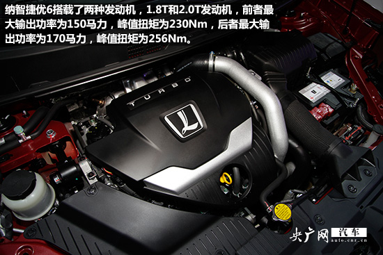 納智捷優(yōu)6搭載了兩種發(fā)動機,1.8T和2.0T發(fā)動機,前者最大輸出功率為150馬力,峰值扭矩為230Nm,后者最大輸出功率為170馬力,峰值扭矩為256Nm。與之匹配的是來自愛信的6AT變速箱。