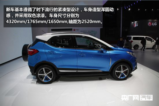 新車基本遵循了時下流行的緊湊型設(shè)計,車身造型渾圓動感,并采用雙色涂漆。車身尺寸分別為4320mm/1765mm/1650mm,軸距為2520mm。前臉的設(shè)計延續(xù)了秦和唐的設(shè)計風格,進氣格柵配以粗壯的鍍鉻飾條更顯兇悍,前大燈采用不規(guī)則造型并融入LED日間行車燈,近光燈帶喲就透鏡。此外,前保險杠采用了“X”型設(shè)計,下方配以銀色護板強調(diào)其SUV屬性。