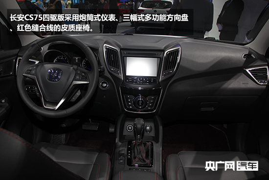 內(nèi)飾方面,長安CS75四驅(qū)版采用炮筒式儀表、三幅式多功能方向盤、紅色縫合線的皮質(zhì)座椅。而檔桿后方相比兩驅(qū)版車型增加了一個在兩驅(qū)和四驅(qū)中轉(zhuǎn)換的按鈕。