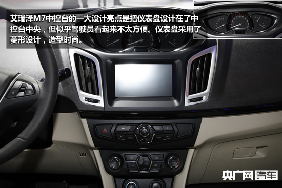 內(nèi)飾方面,艾瑞澤M7采用了懷抱式設(shè)計,層次感明顯,深淺雙色配色方案,營造出溫馨的居家感。艾瑞澤M7中控臺的一大設(shè)計亮點是把儀表盤設(shè)計在了中控臺中央,但似乎駕駛員看起來不太方便。儀表盤采用了菱形設(shè)計,造型時尚。 中控臺配備了7寸彩色觸摸屏,清晰度和靈敏度欠佳。 車內(nèi)還配備了全景天窗,車內(nèi)的采光和通風(fēng)效果得到提升,但尺寸并不算大。