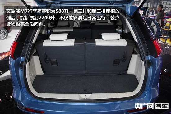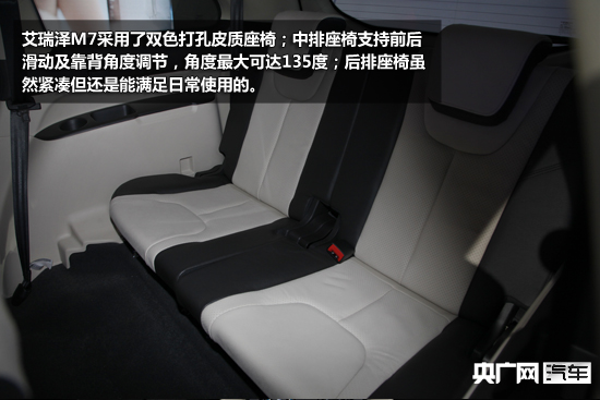 艾瑞澤M7采用了雙色打孔皮質(zhì)座椅,質(zhì)感不錯;中排座椅支持前后滑動及靠背角度調(diào)節(jié),角度最大可達135度,很人性化,第三排沒有乘客的情況下中排乘客可以享受超大空間。 艾瑞澤M7車內(nèi)座椅布局采用2+3+2設(shè)計,行李箱容積為588升,第二排和第三排座椅放倒后,能擴展到2240升,不僅能夠滿足日常出行,裝點貨物也完全沒問題。