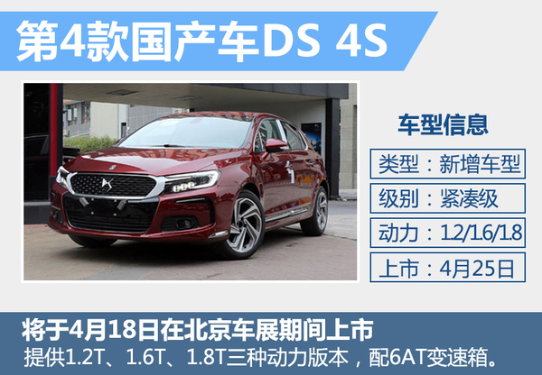 長安標(biāo)致雪鐵龍在中國市場已推出了DS 5LS、DS 5以及DS6,共3款DS品牌的國產(chǎn)車型。此前,DS官方公布了第4款本土化產(chǎn)品DS 4S官方預(yù)售價為14.99-22.99萬元。記者從長安標(biāo)致雪鐵龍汽車有限公司官方了解到,DS 4S將在今日開幕的北京車展中正式上市。DS 4S是一款主要面向年輕消費群體的運動兩廂車,動力上分別搭載1.2T、1.6T、1.8T三款不同排量發(fā)動機。新車正式投放市場后,將與奧迪A3 Sportback等豪華緊湊型兩廂車競爭。