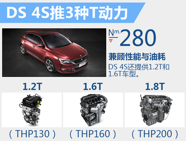 DS 4S三種動力版本的車型排量由小到大將依次被命名為“THP130”、“THP160”和“THP200”。1.2T、1.6T和1.8T這三款THP發(fā)動機由標(biāo)致雪鐵龍公司與寶馬公司合作研發(fā)。由于采用了缸內(nèi)直噴、DVVT雙連續(xù)可變正時系統(tǒng)、全鋁機身、渦輪增壓等技術(shù),這一系列發(fā)動機雖然排量不大,但是最大功率和峰值扭矩兩項數(shù)據(jù)都十分出色。