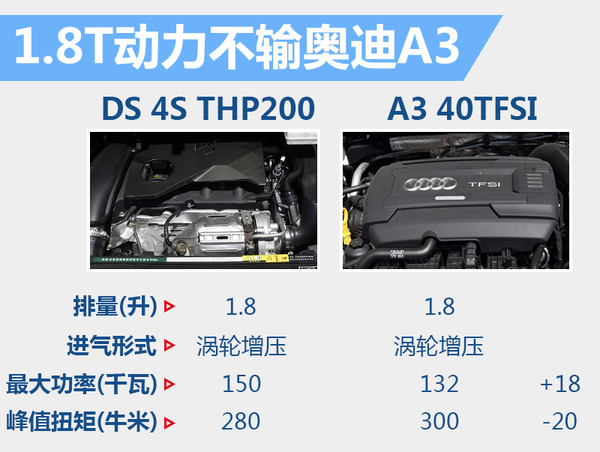 DS 4S的THP130和THP160兩個版本分別搭載1.2T和1.6T發(fā)動機,最大功率分別為100和123千瓦,峰值扭矩分別為230和240牛米。一汽-大眾奧迪國產(chǎn)A3 35TSFI搭載了一臺最大功率與峰值扭矩分別為110千瓦和250牛米的1.4T發(fā)動機。在最大功率方面,DS 4S THP130比奧迪A3 35TSFI低10千瓦,THP160則高出13千瓦。在峰值扭矩方面,DS 4S的THP130和THP160兩個版本均略低于競品。