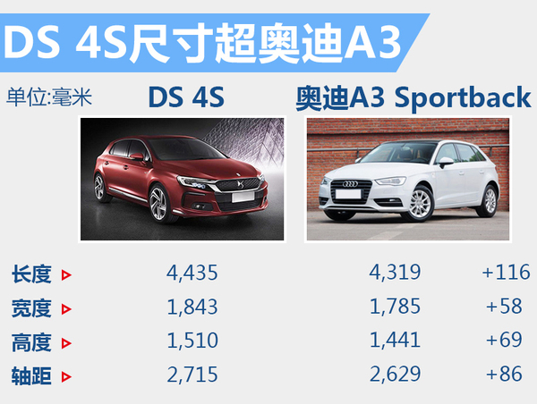 尺寸方面,DS 4S車身長、寬、高分別為4,435*1,843*1,510毫米,軸距達到2,715毫米。與同級別的一汽-大眾奧迪國產(chǎn)A3 Sportback相比,DS 4S的四項尺寸數(shù)據(jù)均有著十分明顯的優(yōu)勢。尤其是車身長度與軸距,DS 4S分別比奧迪A3 Sportback長出116和86毫米之多。