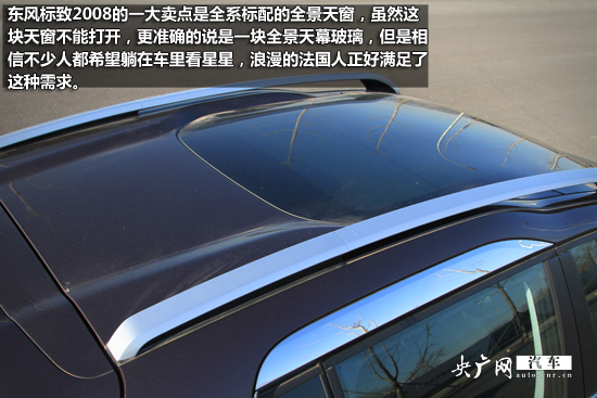 六幅輪轂造型很別致,設(shè)計(jì)上也借鑒了獅標(biāo)的元素。輪胎則采用瑪吉斯VICTRA 510系列,規(guī)格為205/60 R16,非常適合城市SUV所主打的公路性能。行李架的自然要出現(xiàn)在SUV車(chē)型上,而東風(fēng)標(biāo)致2008的一大賣(mài)點(diǎn)是全系標(biāo)配的全景天窗,雖然這塊天窗不能打開(kāi),更準(zhǔn)確的說(shuō)是一塊全景天幕玻璃,但是相信不少人都希望躺在車(chē)?yán)锟葱切,浪漫的法?guó)人正好滿足了這種需求。