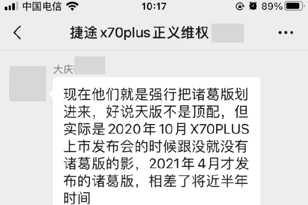 段先生表示,之所以選擇捷途X70PLUS天版車型,正是因為被上市發(fā)布會上重點宣傳的諸多高科技配置深深打動。而提車近兩個月后,才得以知曉這些是半年后上市發(fā)布的諸葛版本車型才能選裝的配置,段先生對此實在無法接受。