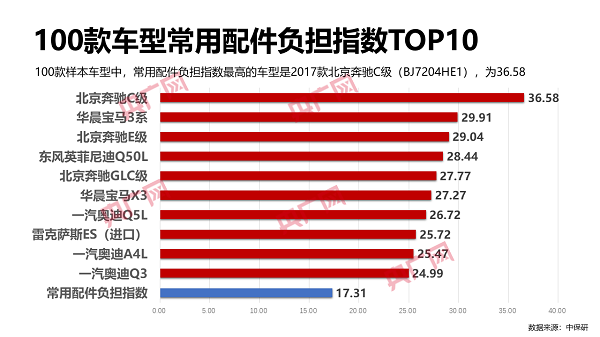 具體車型來看,100款樣本車型中,常用配件負(fù)擔(dān)指數(shù)最高的車型是2017款北京奔馳C級(jí)(BJ7204HE1),為36.58。前十榜單來看,與零整比系數(shù)TOP10類似,BBA車型繼續(xù)霸屏。