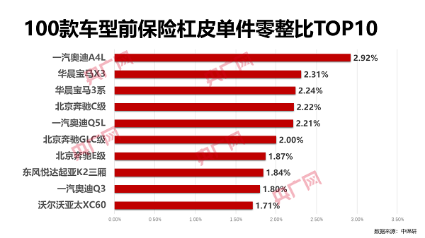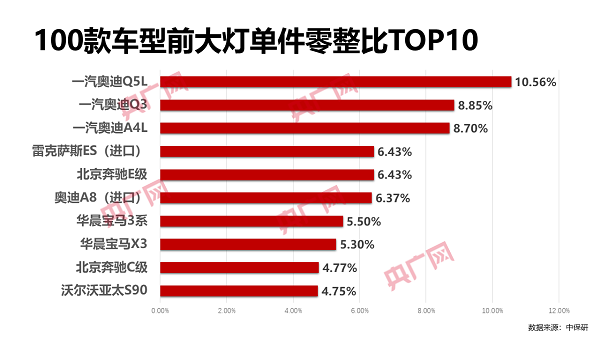 前保險(xiǎn)杠皮單件零整比排名前十車型中,最高的是2018款一汽奧迪A4L(FV7203BADBG),前保險(xiǎn)杠皮單件零整比為2.92%。前大燈單件零整比排名前十車型中,最高的是2020款一汽奧迪Q5L(FV6481LAQDG),前大燈單件零整比為10.56%。舉例來說,9.47個(gè)一汽奧迪Q5L榮享時(shí)尚型(FV6481LAQDG)前大燈的金額可以購買一臺(tái)整車;11.30個(gè)一汽奧迪Q3 時(shí)尚動(dòng)感型(FV7205LCQCB)前大燈的金額可以購買一臺(tái)整車。