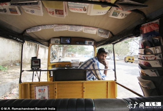 這位來自印度的名叫Annadurai的司機朋友便為他的嘟嘟車增添了不少科技玩意兒,不僅在后排為客人準備了各式各樣的報紙雜志,更提供了免費Wi-Fi服務、車用電視、平板電腦、各種款式的手機充電插頭等配備,為客人提供了相當便利的乘車環(huán)境。