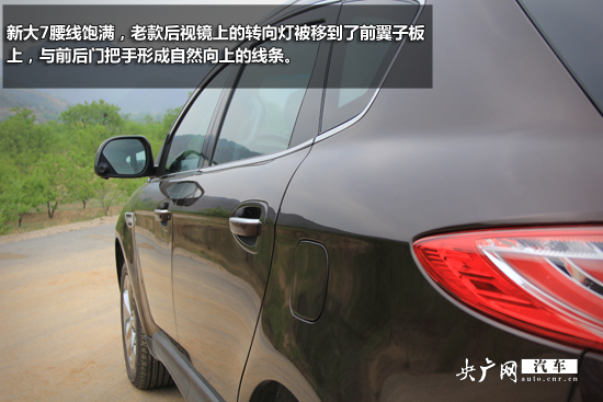 新大7腰線飽滿,老款后視鏡上的轉(zhuǎn)向燈被移到了前翼子板上,與前后門把手形成自然向上的線條。D柱借用了書法中頓筆的設(shè)計(jì)元素,車窗周圍的電鍍裝飾條與原廠鋁合金行李架起到了很好的點(diǎn)綴效果。