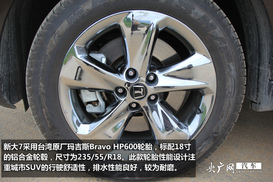 新大7采用臺(tái)灣原廠瑪吉斯Bravo HP600輪胎,出廠標(biāo)配18寸的鋁合金輪轂,輪胎尺寸為235/55/R18。此款輪胎性能設(shè)計(jì)注重城市SUV的行駛舒適性,排水性能良好,較為耐磨。